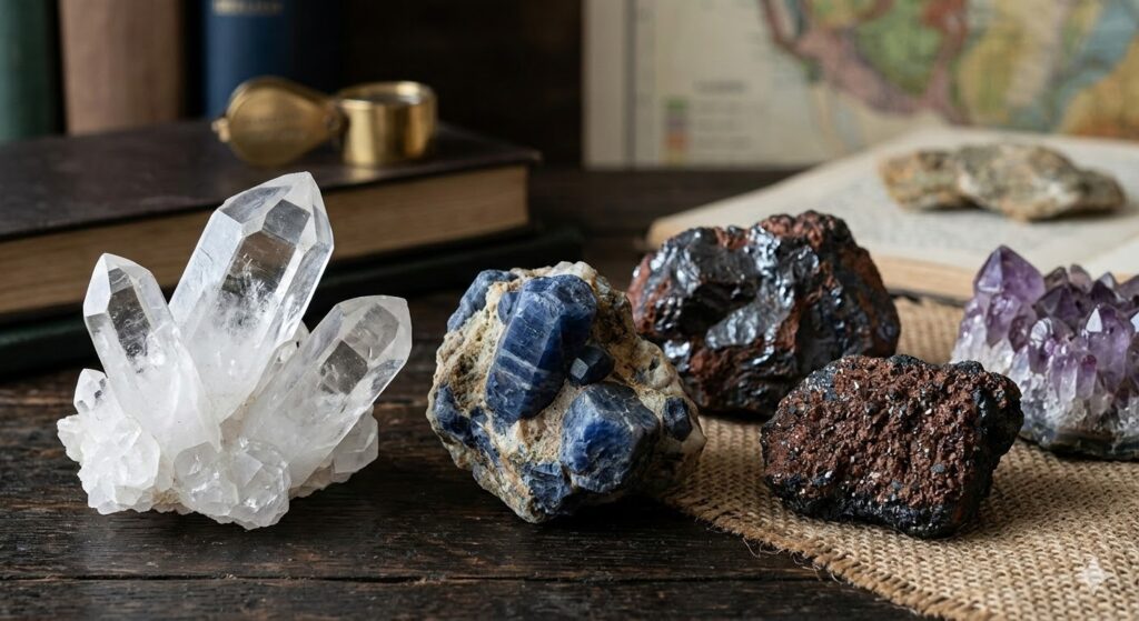 鉱石(Ore)は、有用な金属や鉱物を比較的多く含み、経済的に採掘・利用できる天然の岩石や鉱物の集合体です。赤鉄鉱(鉄)や黄銅鉱(銅)のように、製錬して金属を取り出す原料となるほか、水晶やダイヤモンドのように宝石・観賞用としても利用されます。