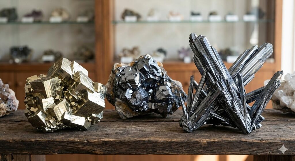 硫化鉱物(黄鉄鉱、輝安鉱など)